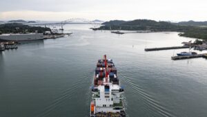 This aerial view shows a cargo ship sailing out of the Panama Canal on the…