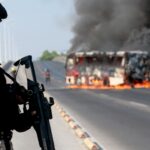 Smoke billows from burning vehicles amid a wave of violence, with torched vehicles and gunmen…