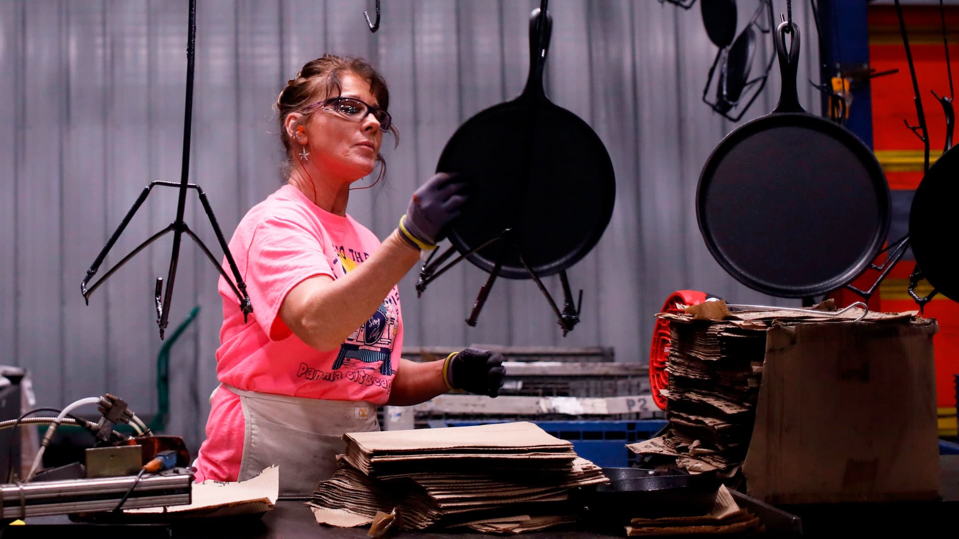 A worker packages cast iron cookware at the Lodge Manufacturing Co. factory in South Pittsburg,…