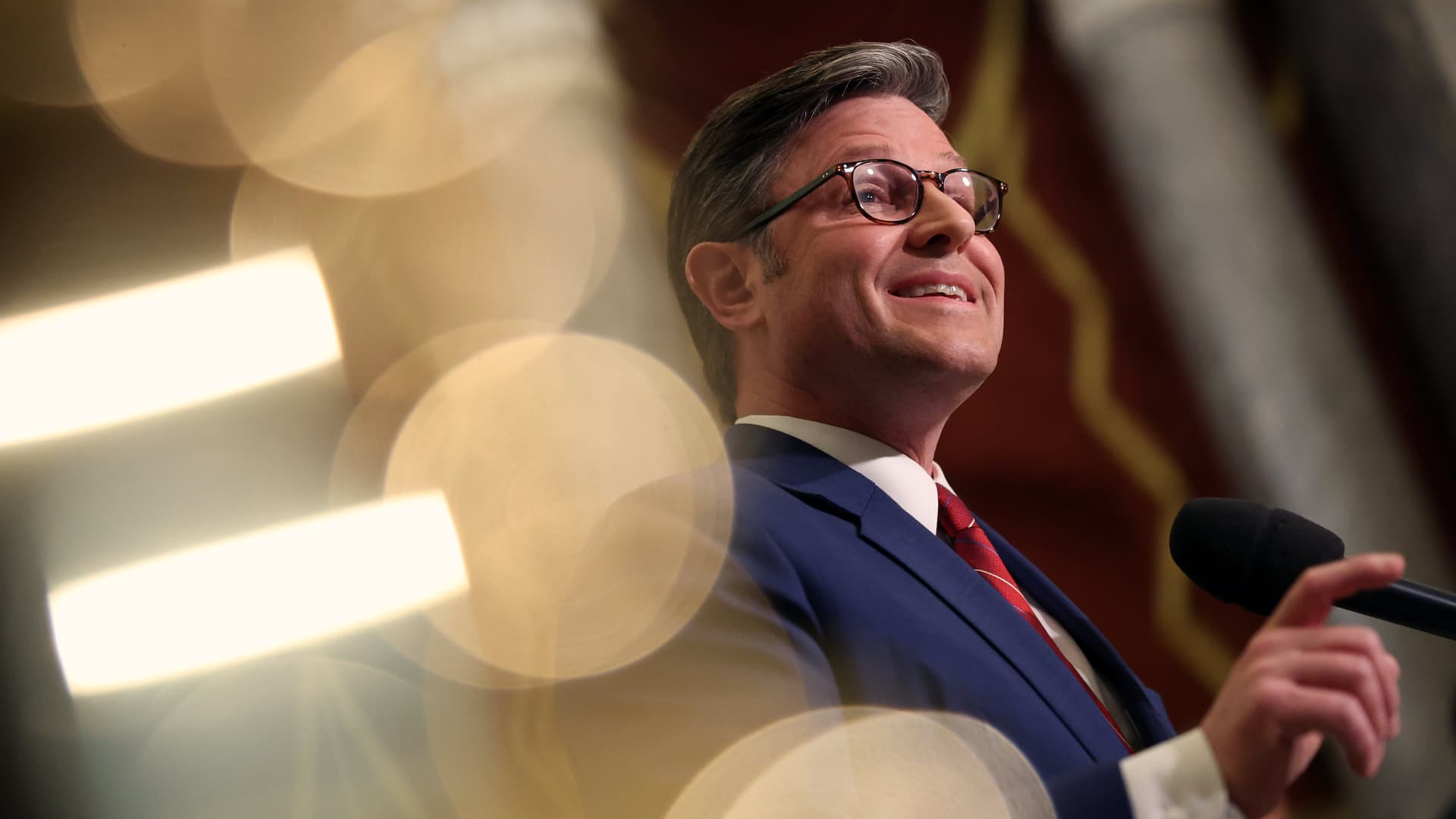 U.S. House Speaker Mike Johnson (R-LA) holds a news conference after the House passed funding…