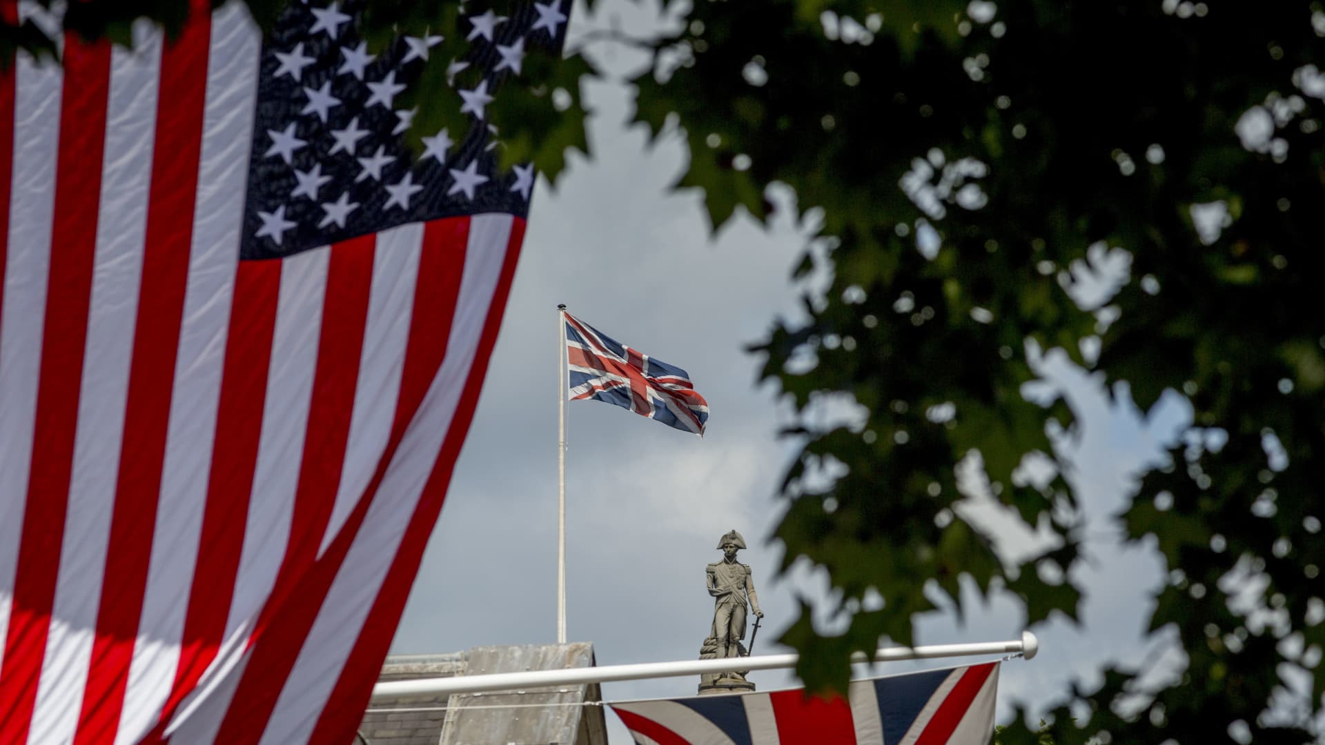 The U.S. Stars and Stripes flag hangs on Whitehall with the figure of Lord Nelson…