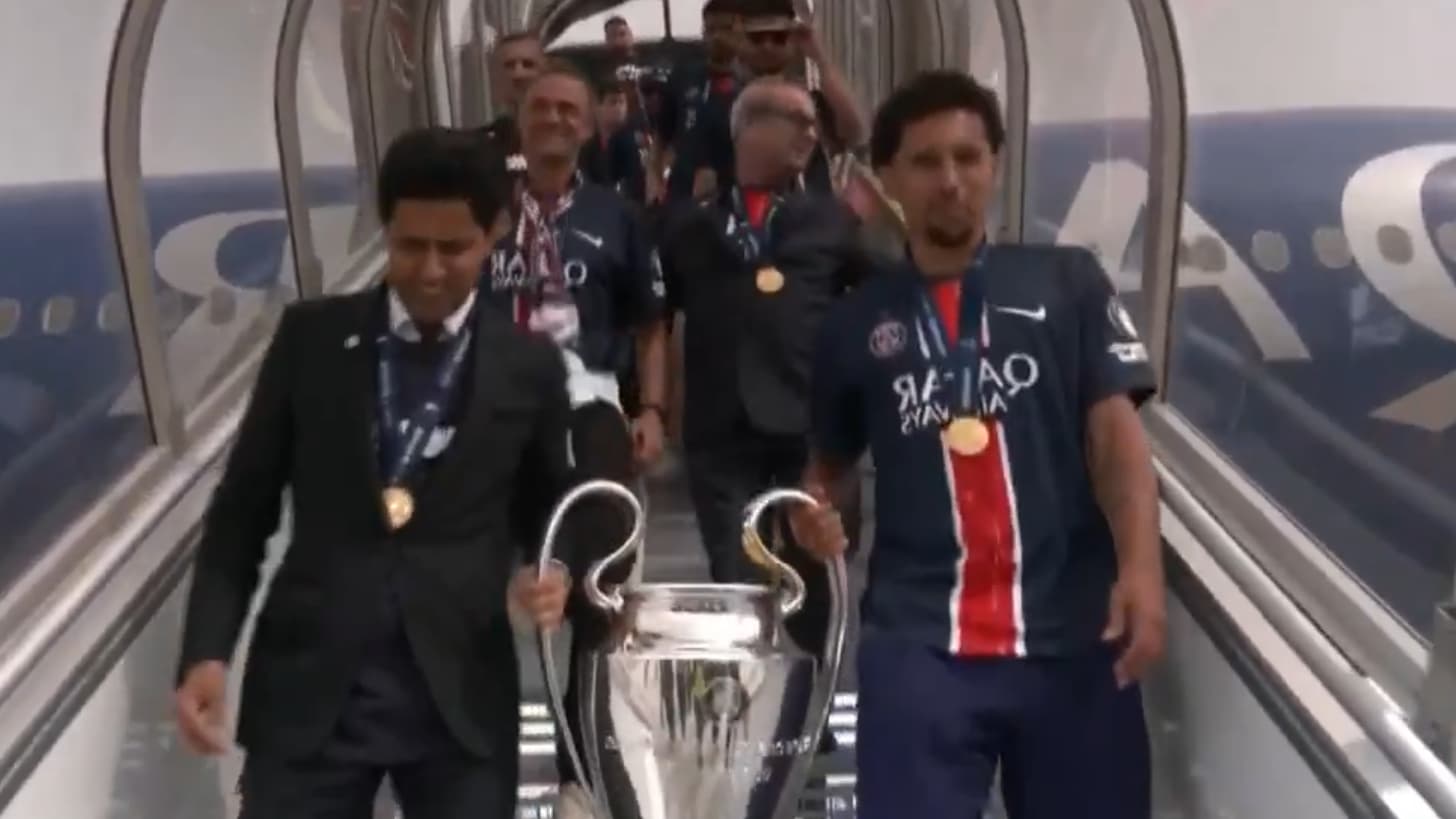 16h23Marquinhos et Nasser Al-Khelaïfi descendent de l'avion en premierMaillot du PSG sur le dos, Marquinhos…