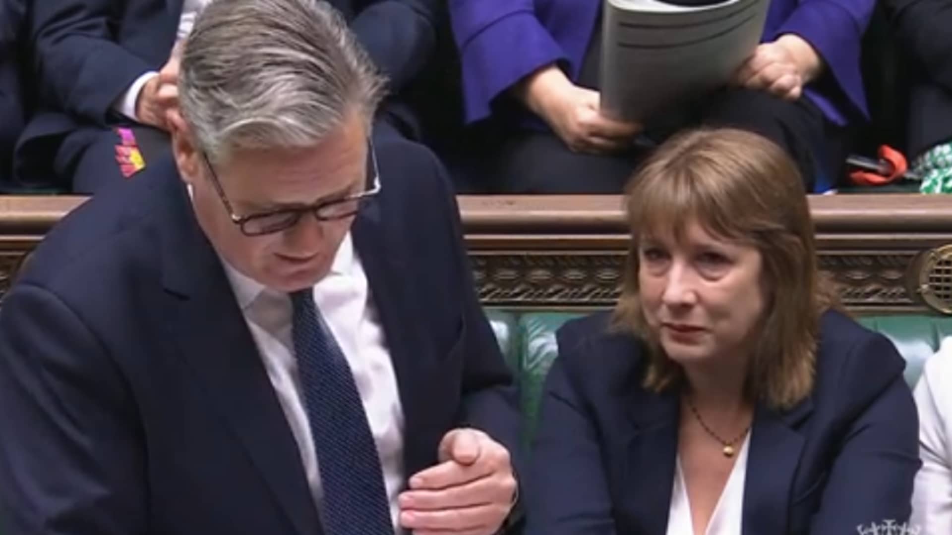 Prime Minister Keir Starmer and Finance Minister Rachel Reeves to his right, looking visibly upset, in the House of Commons on Wednesday.